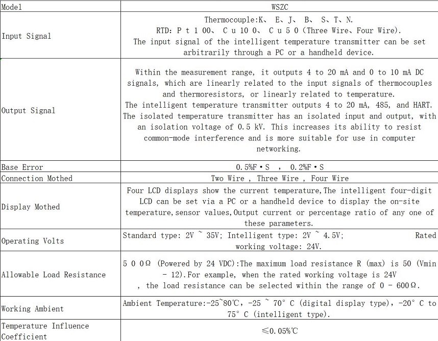 Integrované Vysílač teploty je složen z modulu teplotního převodníku a průmyslových termočlánků nebo termoresistorů. Přijímá dvouvodičové, třívodičové a čtyřvodičové metody přenosu. Převádí signály průmyslového termočlánku a odporu na lineární výstupní signály 4-20 mA nebo 0-10ma. Tento vysílač lze přímo nainstalovat do spojovacího boxu termočlánků nebo termoresistorů za vzniku integrované struktury. Jako nová generace nástroje měření teploty může být široce aplikována v průmyslových odvětvích, jako je metalurgie, ropa, chemický průmysl, síla, lehký průmysl, textil, potraviny, národní obrana a vědecký výzkum.